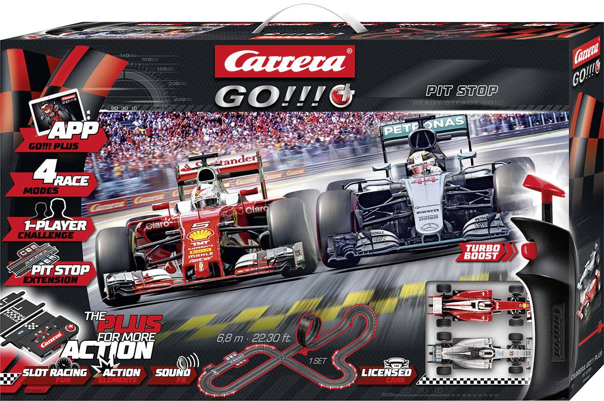 Wenn zwei Formel-1-Weltmeister im neuen Formel-1 Carrera GO!!! Plus Set „Pit Stop“ an den Start gehen, ist Rennaction auf höchstem Niveau garantiert. Die 6,8 Meter lange Carrera Autorennbahn hält mit atemberaubendem Looping, Geraden, die zum Durchdrücken des Handreglers einladen und herausfordernden Fly-Over einige Überraschungen für Lewis Hamilton und Sebastian Vettel bereit. Der deutsche Sebastian Vettel tritt mit seinem Ferrari SF16-H an, der sich besonders im Bereich der Fahrzeugnase vom Vorgängermodell entscheidet. Lewis Hamiltons Mercedes F1 W07 Hybrid konnte ihm bereits einen seiner Weltmeistertitel garantieren. Weiters stellen das Pit-Stop-Game mit den Aufgaben Reifenwechsel, Motorservice und Auftanken, sowie die über die GO!!! Plus Anschluss-Schiene funktionierende gratis App mit lustigen Spielen, die kleinen Rennfahrer vor spannende Herausforderungen.