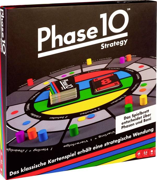 Beim Ziehen über das Spielbrett bildet man die Phasen der Felder, auf denen man landet jedes Spiel ist anders! Phase 10 Strategy wird über mehrere Runden gespielt, in denen die Spieler reihum ihre Spielsteine so über das Spielbrett bewegen, dass sie Kartenkombinationen bilden können, die als Phasen bezeichnet werden. Die Spieler müssen ihre Züge gut planen, da sie eine Phase nur dann bilden können, wenn ihr Spielstein sich auf dem entsprechenden Feld befindet. Außerdem darf ein Spieler pro Runde nur eine einzige Phase bilden. Sobald ein Spieler eine vollständige Phase ausgespielt hat und seine restlichen Karten losgeworden ist, endet die Runde. Dann erhalten alle Spieler neue Karten und die nächste Runde beginnt. Wer als Erster seine zehnte Phase abschließt und dann seine restlichen Karten loswird, gewinnt! Jedes Kartendeck enthält Joker-Karten, die die Spannung steigern und den Spielern helfen können, einer kniffligen Situation zu entkommen.