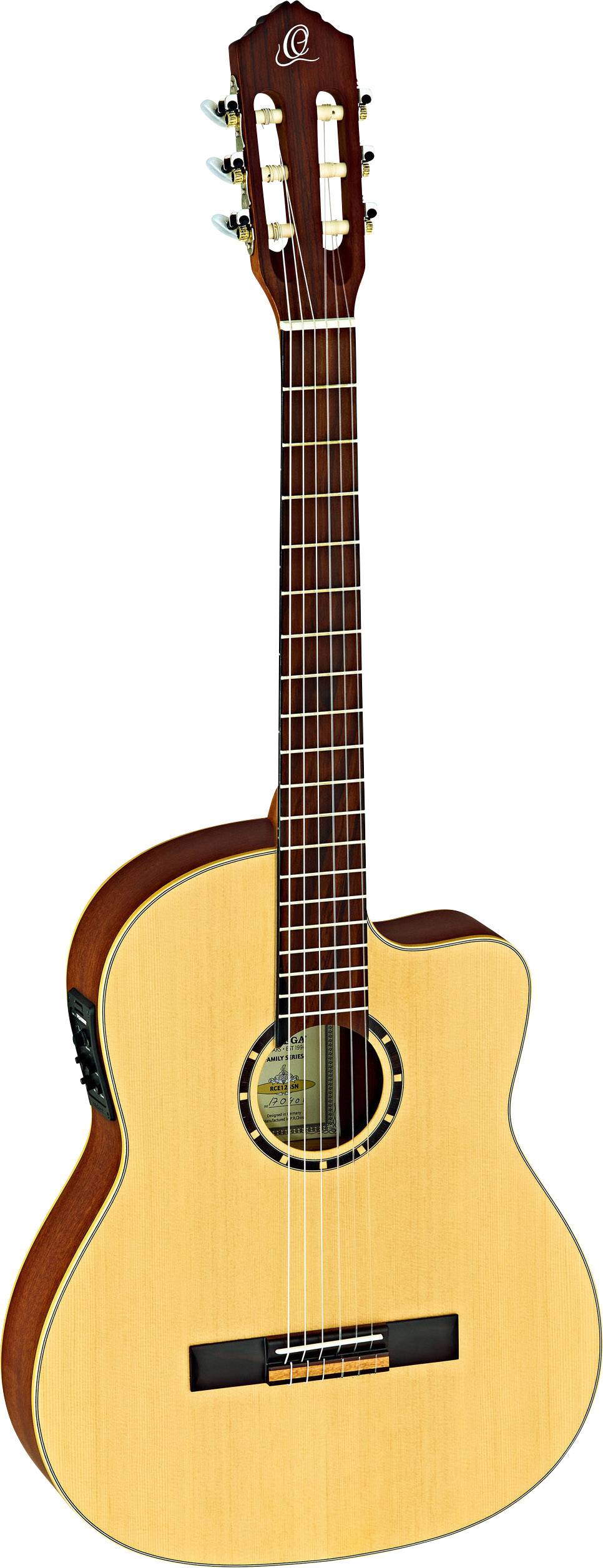 Die preiswerte RCE125SN aus dem Hause Ortega ist der optimale Begleiter für den Einsatz auf der Bühne. Dementsprechend birgt der laminierte Korpus, bestehend aus einer Fichtendecke und Zargen und Boden aus Mahagoni, den Vorteil der relativen Resistenz gegen unerwünschte Rückkopplungen, während der hauseigene Magus Pro-NL Tonabnehmer einen warmen und dynamischen Bühnensound produziert. Zudem ist dieser Pickup mit einem Stimmgerät, einem 3-Band Equalizer und einem Phasenschalter ausgestattet. Dabei liegt der schlanke Hals mit einer Sattelbreite von 48mm gut in der Hand und liefert eine weiche Bespielbarkeit. Darüber hinaus ist dank Cutaway auch das Greifen in den höheren Lagen problemlos möglich. Nicht zuletzt ist bereits eine Gigbag im Lieferumfang enthalten.