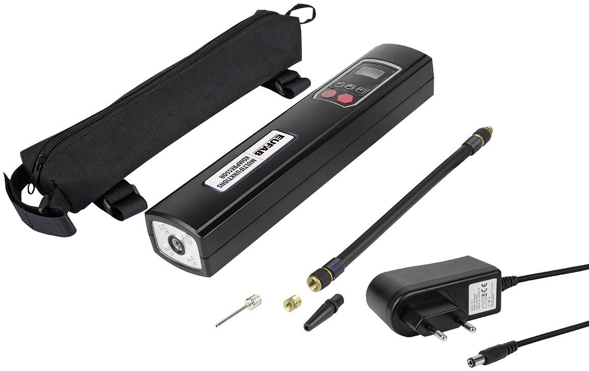 Ihre Fahrradreifen müssen aufgepumpt werden? Kein Problem! Die Fußbälle der Kids könnten auch mal wieder Luft gebrauchen? Kein Problem! Sie sind im Urlaub und die Schwimmtiere müssen mit Luft befüllt werden? Auch das ist mit dem aufladbaren Multifunktions-Kompressor kein Problem. Der mobile Kompressor von EUFAB ist in 4 Stunden aufgeladen. Anschließend liefert er einen maximalen Druck von bis zu 8 bar. Der Druck kann vorher eingestellt werden und das Gerät schaltet sich nach Erreichen selbstständig ab. Der Kompressor kann durch seine kompakte Größe und eine Tragetasche überall mit hin mitgenommen werden. Im Lieferumfang des Multifunktions-Kompressors befinden sich vier Adapter, für nahezu alle gängigen Ventile. Mit dem Kompressor von EUFAB erhalten Sie einen langjährigen Weggefährten, mit welchem Ihnen die Luft garantiert nicht ausgeht.