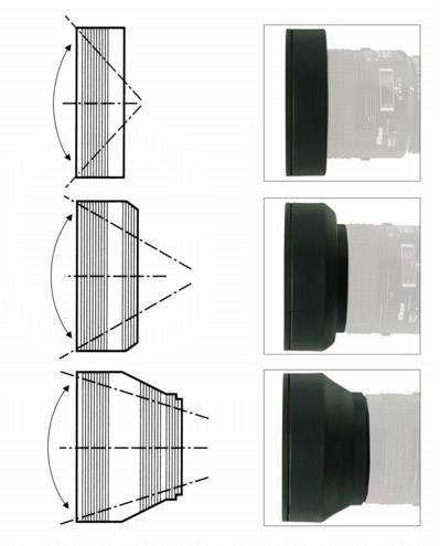 Für Objektivbrennweiten von 28 bis 200 mm (bezogen auf Kleinbildformat). Aus mattschwarzem Gummi, faltbar. Mit Lichtbrechrillen. Metalleinschraubfassung. Filtergewinde. - ø 37 mm