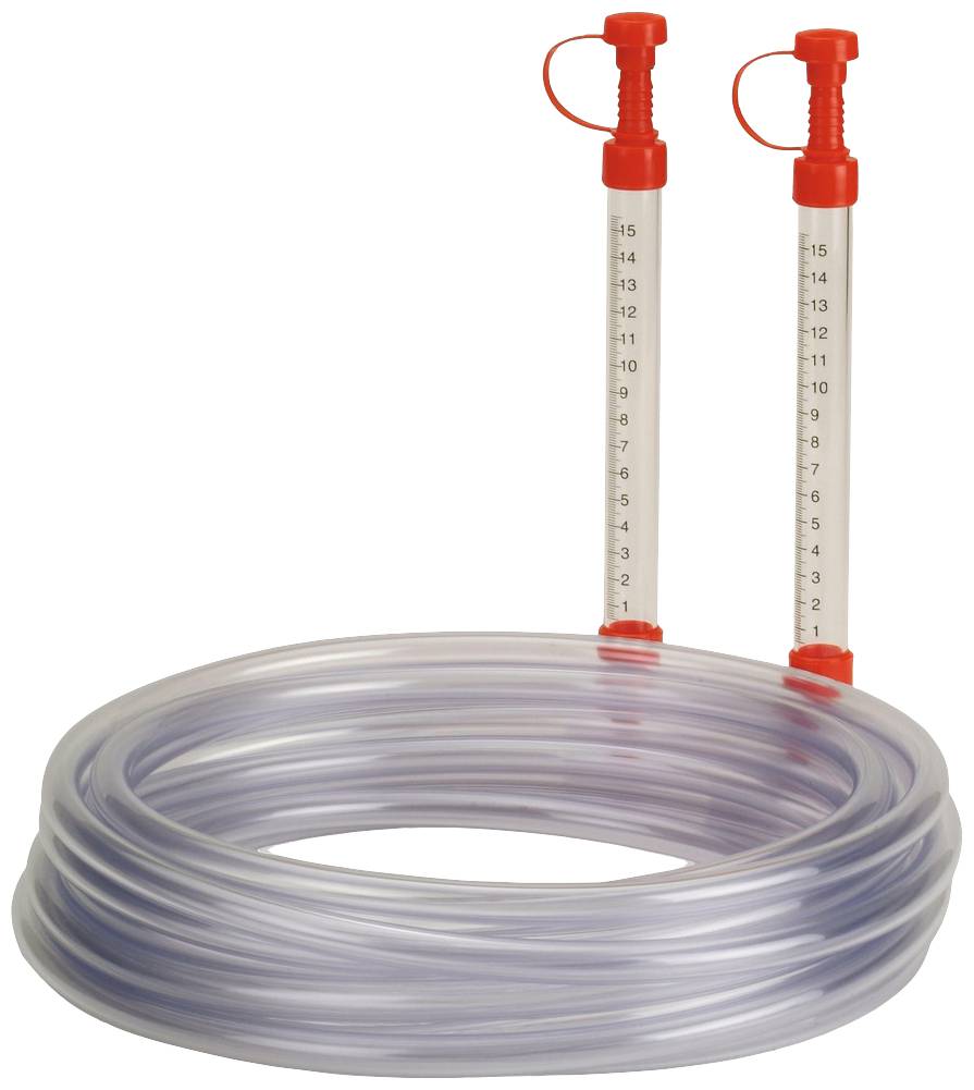Wasserwaage zum Übertragen der Höhe, zum Beispiel von einem Raum in den anderen. Zwei Kunststoffzylinder mit Skalenaufdruck (130 mm). Kunststoffschlauch mit 10 mm Durchmesser.