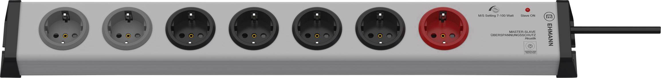 1 rote Master-Steckdose, 4 schwarze Slave-Steckdosen und 2 graue Permanent-Steckdosen