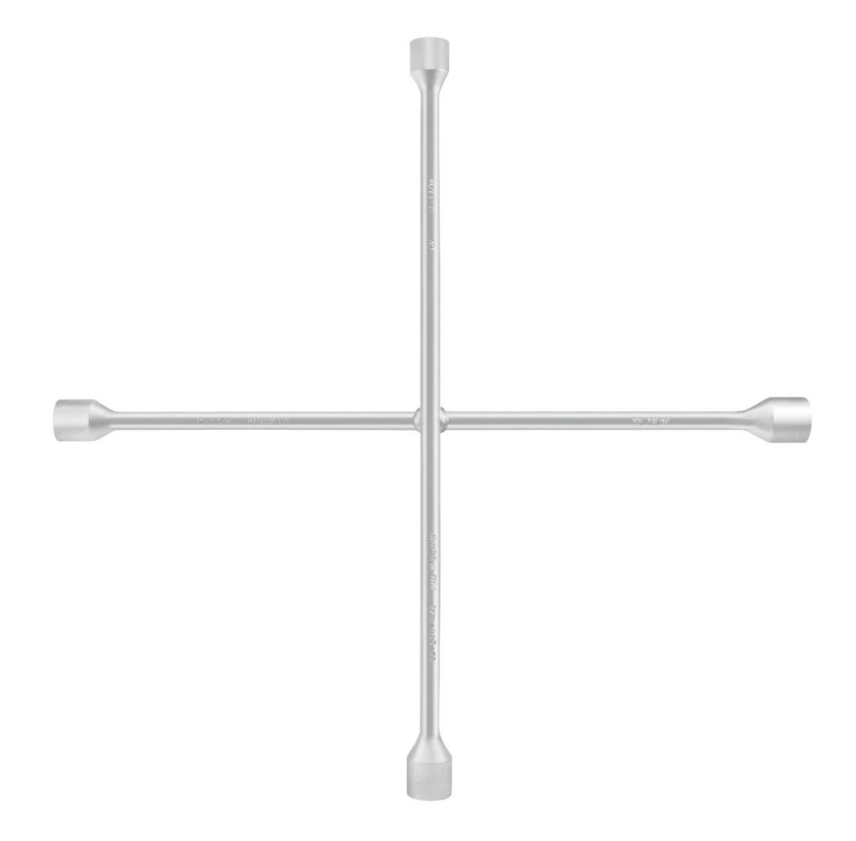 Kreuzschlüssel für LKW. Geschweißte Ausführung. Für Nutzfahrzeuge. Gehärtet. Normen: DIN 3119 / ISO 6788. Material: Chrom-Vanadium. Oberfläche: Matt verchromt.