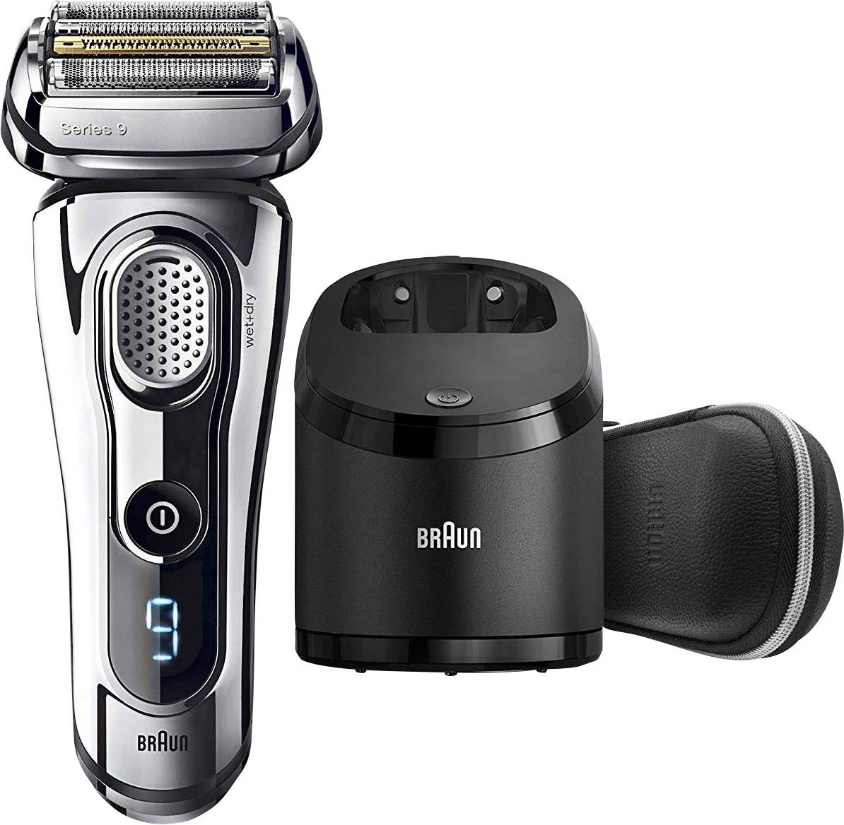 Series 9 Chrom Wet & Dry Rasierer + Reinigungskartusche (1x) + SmartPlug + Reise-Etui aus Leder + Reinigungsbürste.