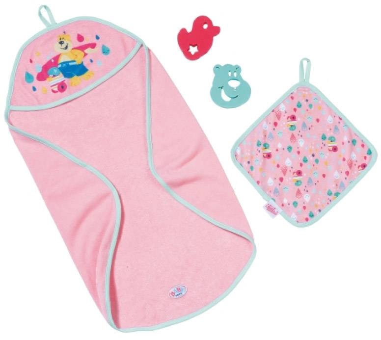 BABY born hat heute ganz viel Sandkuchen gebacken und hat nun Matschhände, die Sandkörner kleben an den Füßen und das ganze Püppchen ist mit Blättern und Blüten verziert. Da braucht es schon einen großen Waschlappen und viel Wasser, damit die Kleine wieder sauber wird. Der Lappen ist mit Tropfen und Badeente Berta bedruckt und kann wunderbar im Bad aufgehängt werden. Die Schwämmchen teilt sich BABY born mit ihrer Sister. Die Ente für den kleine Dreckspatz, der Bärenschwamm für den großen. Danach kuschelt sie sich in ihr Handtuch mit Kapuze und denkt sich weitere Sandkuchenrezepte aus. ,,Original Kleidung für die BABY born Markenspielpuppe. ,,Erweitert die Spielmöglichkeiten, regt die Fantasie an und fördert kreatives Rollenspiel. ,,Kinderleichtes An- und Ausziehen. BABY born Bath Kapuzenhandtuch & Schwamm aus Handtuch mit Kapuze, Waschlappen und 2 Schwämmchen.