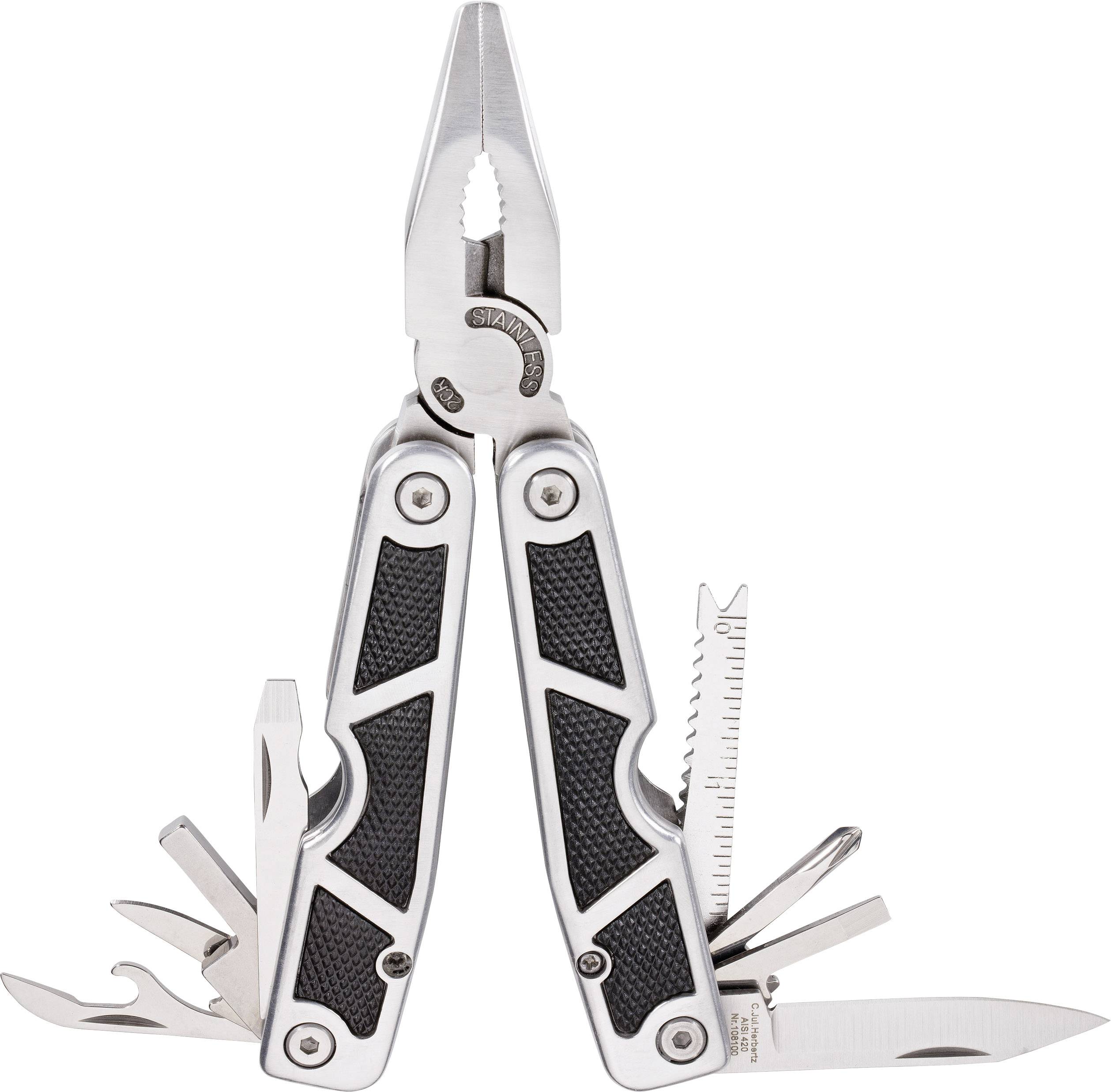Zusätzlich zur Zange mit Drahtschneider bietet dieses kompakte Multitool aus dem Hause Herbertz gleich 8 weitere Werkzeuge, angefangen bei der klassischen Messerklinge über Flaschenöffner und Schraubenzieher bis zum Fischschupper. Ebenfalls zur Ausstattung gehört ein Adapter mit 9-teiligem Bitsatz. Das Heft ist mit griffigen Kunststoff-Einlagen versehen.
