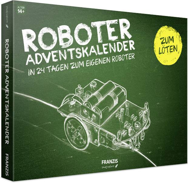 Mit diesem Adventskalender löten Kinder und Erwachsene in der Adventszeit nach und nach ihren eigenen Roboter zusammen. Am 24. Dezember halten sie dann einen voll funktionsfähigen Fährtenleser-Roboter, der beharrlich jeder schwarzen Linie folgen wird, in den Händen. Das enthaltene umfangreiche Handbuch führt außerdem ein in die Welt der Elektronik und ihrer wichtigsten Bauteile.