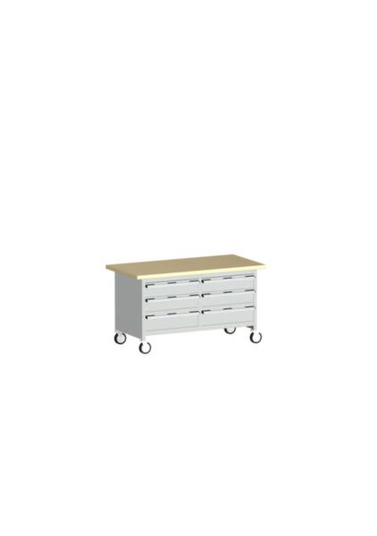 Fahrbare Kastenwerkbank, Höhe x Breite x Tiefe 840 x 1500 x 750 mm, Tischplatte aus Rotbuche, geölt, Plattenstärke 40 mm, Traglast 1200 kg, Unterbau 6 Schubladen, links 3 Schubladen, rechts 3 Schubladen, Traglast je Schublade 75 kg, Schubladen auf kugelgelagerten Laufschienen, Auszug 100 %, mit Normallastauszug, Stahlkonstruktion, Gestell mit Pulverbeschichtung in RAL7035 Lichtgrau, Front mit Pulverbeschichtung in RAL7035 Lichtgrau, Unterbau mit 4 Lenkrollen.