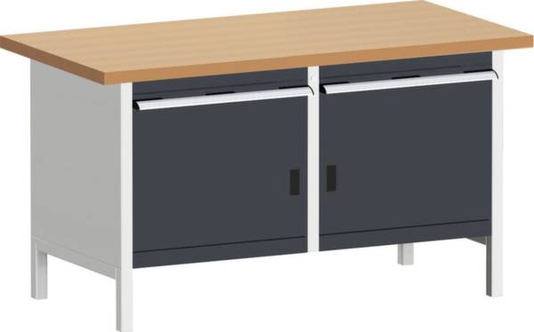 Kastenwerkbank, Höhe x Breite x Tiefe 840 x 1500 x 750 mm, Tischplatte aus Rotbuche, geölt, Plattenstärke 40 mm, Traglast 1200 kg, Gestellausführung 4 Füße, Unterbau 2 Schubladen, 2 Schränke, links 1 Schublade, 1 Schrank, rechts 1 Schublade, 1 Schrank, Türinnenseite mit Perfo-Lochung, Traglast je Schublade 75 kg, Schubladen auf kugelgelagerten Laufschienen, Auszug 100 %, mit Normallastauszug, mit Griffleiste, Schubladen und Schrank getrennt verschließbar, Stahlkonstruktion, Gestell mit Pulverbeschichtung in RAL7035 Lichtgrau, Front mit Pulverbeschichtung in RAL7016 Anthrazitgrau.