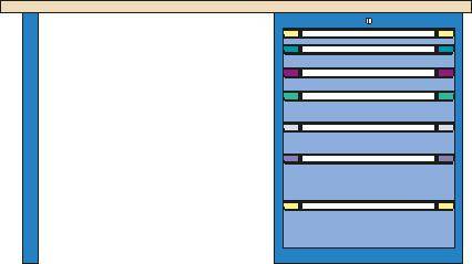 Werkbank, Höhe x Breite x Tiefe 840 x 2000 x 700 mm, Tischplatte aus Multiplex, Plattenstärke 40 mm, Traglast 75 kg, Gestellausführung 2 Füße / 1 Schrankblock, Unterbau 7 Schubladen, Schubladen Höhe 1x50 mm/2x75 mm/2x100 mm/2x150 mm, Schubladennutzmaß Breite x Tiefe 500 x 600 mm, Traglast je Schublade 75 kg, Schubladen mit kugelgelagerten Teleskopschienen, Auszug 100 %, Schubladen zur Aufnahme von Einteilungsmaterial geschlitzt, mit Griffleiste, mit Beschriftungsstreifen, verschließbar mit Zylinderschloss, Stahlkonstruktion, Gestell mit Pulverbeschichtung in Farbe wählbar, Front mit Pulverbeschichtung in Farbe wählbar.