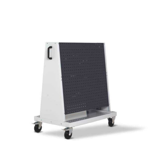 Lochplatten-Rollwagen, Höhe x Breite x Tiefe 1600 x 1000 x 650 mm, 4 x Lochplatte, Platten gerade oder geneigt montierbar, in RAL7016 Anthrazitgrau, aus Stahl, Lochabstand 38,1 mm, mit Bodenwanne als Stauraum, 2 Lenk- und 2 Bockrollen, Lenkrollen mit Feststellern.