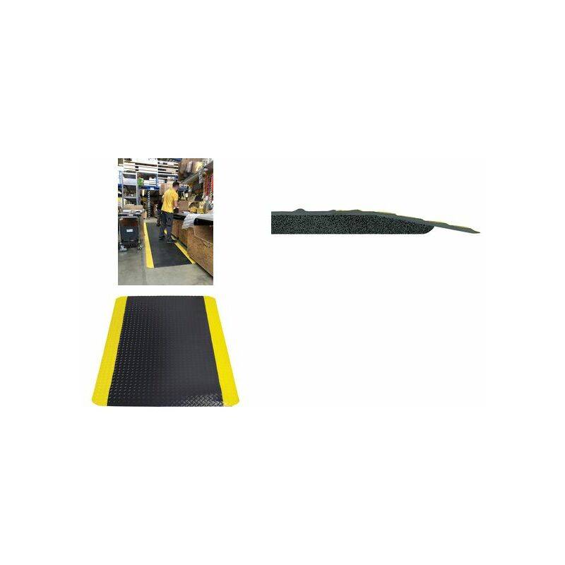 Arbeitsplatzmatte, Länge x Breite 1500 x 900 mm, für Betrieb, aus PVC mit Rauten-Profil in schwarz/gelb, mit allseitig abgeschrägten Kanten, isolierend, rutschhemmend und lärmdämmend, fördert Entlastung von Rücken und Beinen, beständig gegen Öle und Chemikalien, temperaturbeständig bis +60°C, geprüft gemäß DIN 51130 R10.