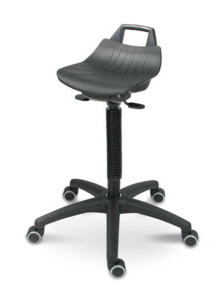 Stehhilfe - Komfort Sitz: - Großflächiger Sitz aus Kunststoff - Sitzneigunsverstellung um 15° - Höhenverstellbar mittels Gasfeder. Gestell: - Fünffußgestell aus Kunststoff - Mit lastabhängig gebremsten Doppelrollen.