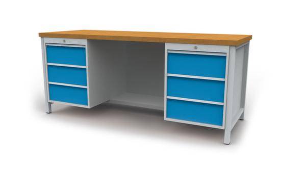 Werkbank, Höhe x Breite x Tiefe 860 x 2000 x 750 mm, Tischplatte aus Buche-Massivholz, geölt, Plattenstärke 40 mm, Traglast 100 kg, Gestellausführung 4 Füße, Unterbau 6 Schubladen, 1/2 Ablageboden, links 3 Schubladen, mitte 1/2 Ablageboden, rechts 3 Schubladen, Schubladen Höhe 6x200 mm, Schubladennutzmaß Breite x Tiefe 450 x 600 mm, Traglast je Schublade 100 kg, Schubladen mit kugelgelagerter Rollenführung, Auszug 100 %, Schubladen zur Aufnahme von Einteilungsmaterial geschlitzt, mit Einzelauszugsperre, mit Griffleiste, mit Beschriftungsstreifen, verschließbar mit Zylinderschloss, Stahlkonstruktion, Gestell mit Pulverbeschichtung in Farbe wählbar, Front mit Pulverbeschichtung in Farbe wählbar.