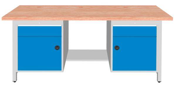 Werkbank, Höhe x Breite x Tiefe 860 x 2000 x 750 mm, Tischplatte aus Buche-Massivholz, geölt, Plattenstärke 40 mm, Traglast 100 kg, Gestellausführung 4 Füße, Unterbau 2 Schubladen, 2 Schränke, 1/2 Ablageboden, links 1 Schublade, 1 Schrank, mitte 1/2 Ablageboden, rechts 1 Schublade, 1 Schrank, Schubladen Höhe 2x150 mm, Schubladennutzmaß Breite x Tiefe 450 x 600 mm, Traglast je Schublade 100 kg, Schubladen mit kugelgelagerter Rollenführung, Auszug 100 %, Schubladen zur Aufnahme von Einteilungsmaterial geschlitzt, mit Einzelauszugsperre, mit Griffleiste, mit Beschriftungsstreifen, verschließbar mit Zylinderschloss, Schubladen und Schrank gemeinsam verschließbar, Stahlkonstruktion, Gestell mit Pulverbeschichtung in Farbe wählbar, Front mit Pulverbeschichtung in Farbe wählbar.
