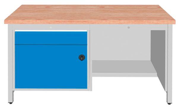 Werkbank, Höhe x Breite x Tiefe 860 x 1500 x 750 mm, Tischplatte aus Buche-Massivholz, geölt, Plattenstärke 40 mm, Traglast 100 kg, Gestellausführung 4 Füße, Unterbau 1 Schublade, 1 Schrank, 1/2 Ablageboden, links 1 Schublade, 1 Schrank, rechts 1/2 Ablageboden, Schubladen Höhe 1x150 mm, Schubladennutzmaß Breite x Tiefe 600 x 600 mm, Traglast je Schublade 100 kg, Schubladen mit kugelgelagerter Rollenführung, Auszug 100 %, Schubladen zur Aufnahme von Einteilungsmaterial geschlitzt, mit Einzelauszugsperre, mit Griffleiste, mit Beschriftungsstreifen, verschließbar mit Zylinderschloss, Schubladen und Schrank gemeinsam verschließbar, Stahlkonstruktion, Gestell mit Pulverbeschichtung in Farbe wählbar, Front mit Pulverbeschichtung in Farbe wählbar.