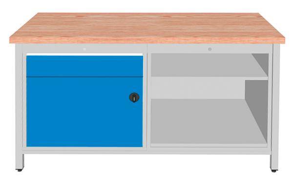 Werkbank, Höhe x Breite x Tiefe 860 x 1500 x 750 mm, Tischplatte aus Buche-Massivholz, geölt, Plattenstärke 40 mm, Traglast 100 kg, Gestellausführung 4 Füße, Unterbau 1 Schublade, 1 Schrank, 2 Ablageböden, links 1 Schublade, 1 Schrank, rechts 2 Ablageböden, Schubladen Höhe 1x150 mm, Schubladennutzmaß Breite x Tiefe 600 x 600 mm, Traglast je Schublade 100 kg, Schubladen mit kugelgelagerter Rollenführung, Auszug 100 %, Schubladen zur Aufnahme von Einteilungsmaterial geschlitzt, mit Einzelauszugsperre, mit Griffleiste, mit Beschriftungsstreifen, verschließbar mit Zylinderschloss, Schubladen und Schrank gemeinsam verschließbar, Stahlkonstruktion, Gestell mit Pulverbeschichtung in Farbe wählbar, Front mit Pulverbeschichtung in Farbe wählbar.