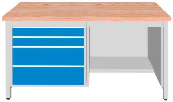 Werkbank, Höhe x Breite x Tiefe 860 x 1500 x 750 mm, Tischplatte aus Buche-Massivholz, geölt, Plattenstärke 40 mm, Traglast 100 kg, Gestellausführung 4 Füße, Unterbau 4 Schubladen, 1/2 Ablageboden, links 4 Schubladen , rechts 1/2 Ablageboden, Schubladen Höhe 2x100 mm/2x200 mm, Schubladennutzmaß Breite x Tiefe 600 x 600 mm, Traglast je Schublade 100 kg, Schubladen mit kugelgelagerter Rollenführung, Auszug 100 %, Schubladen zur Aufnahme von Einteilungsmaterial geschlitzt, mit Einzelauszugsperre, mit Griffleiste, mit Beschriftungsstreifen, verschließbar mit Zylinderschloss, Stahlkonstruktion, Gestell mit Pulverbeschichtung in Farbe wählbar, Front mit Pulverbeschichtung in Farbe wählbar.