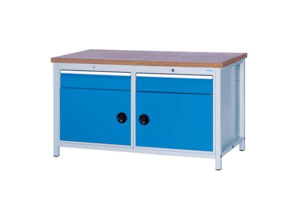 Werkbank, Höhe x Breite x Tiefe 860 x 1500 x 750 mm, Tischplatte aus Buche-Massivholz, geölt, Plattenstärke 40 mm, Traglast 100 kg, Gestellausführung 4 Füße, Unterbau 2 Schubladen, 2 Schränke, links 1 Schublade, 1 Schrank, rechts 1 Schublade, 1 Schrank, Schubladen Höhe 2x150 mm, Schubladennutzmaß Breite x Tiefe 600 x 600 mm, Traglast je Schublade 100 kg, Schubladen mit kugelgelagerter Rollenführung, Auszug 100 %, Schubladen zur Aufnahme von Einteilungsmaterial geschlitzt, mit Einzelauszugsperre, mit Griffleiste, mit Beschriftungsstreifen, verschließbar mit Zylinderschloss, Schubladen und Schrank gemeinsam verschließbar, Stahlkonstruktion, Gestell mit Pulverbeschichtung in Farbe wählbar, Front mit Pulverbeschichtung in Farbe wählbar.