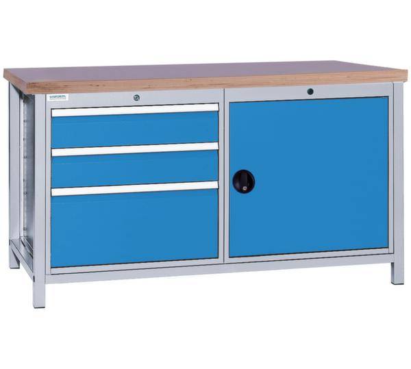 Werkbank, Höhe x Breite x Tiefe 860 x 1500 x 750 mm, Tischplatte aus Buche-Massivholz, geölt, Plattenstärke 40 mm, Traglast 100 kg, Gestellausführung 4 Füße, Unterbau 3 Schubladen, 1 Schrank, links 3 Schubladen, rechts 1 Schrank, Schrank mit 1 verstellbaren Boden, Schubladen Höhe 3x200 mm, Schubladennutzmaß Breite x Tiefe 600 x 600 mm, Traglast je Schublade 100 kg, Schubladen mit kugelgelagerter Rollenführung, Auszug 100 %, Schubladen zur Aufnahme von Einteilungsmaterial geschlitzt, mit Einzelauszugsperre, mit Griffleiste, mit Beschriftungsstreifen, verschließbar mit Zylinderschloss, Schubladen und Schrank gemeinsam verschließbar, Stahlkonstruktion, Gestell mit Pulverbeschichtung in Farbe wählbar, Front mit Pulverbeschichtung in Farbe wählbar.