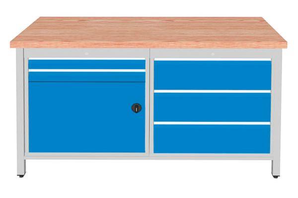 Werkbank, Höhe x Breite x Tiefe 860 x 1500 x 750 mm, Tischplatte aus Buche-Massivholz, geölt, Plattenstärke 40 mm, Traglast 100 kg, Gestellausführung 4 Füße, Unterbau 5 Schubladen, 1 Schrank, links 2 Schubladen, 1 Schrank, rechts 3 Schubladen, Schubladen Höhe 2x75 mm/3x200 mm, Schubladennutzmaß Breite x Tiefe 600 x 600 mm, Traglast je Schublade 100 kg, Schubladen mit kugelgelagerter Rollenführung, Auszug 100 %, Schubladen zur Aufnahme von Einteilungsmaterial geschlitzt, mit Einzelauszugsperre, mit Griffleiste, mit Beschriftungsstreifen, verschließbar mit Zylinderschloss, Schubladen und Schrank gemeinsam verschließbar, Stahlkonstruktion, Gestell mit Pulverbeschichtung in Farbe wählbar, Front mit Pulverbeschichtung in Farbe wählbar.