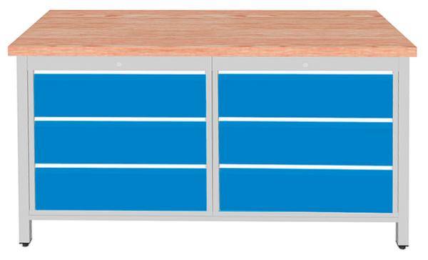 Werkbank, Höhe x Breite x Tiefe 860 x 1500 x 750 mm, Tischplatte aus Buche-Massivholz, geölt, Plattenstärke 40 mm, Traglast 100 kg, Gestellausführung 4 Füße, Unterbau 6 Schubladen, links 3 Schubladen, rechts 3 Schubladen, Schubladen Höhe 6x200 mm, Schubladennutzmaß Breite x Tiefe 600 x 600 mm, Traglast je Schublade 100 kg, Schubladen mit kugelgelagerter Rollenführung, Auszug 100 %, Schubladen zur Aufnahme von Einteilungsmaterial geschlitzt, mit Einzelauszugsperre, mit Griffleiste, mit Beschriftungsstreifen, verschließbar mit Zylinderschloss, Stahlkonstruktion, Gestell mit Pulverbeschichtung in Farbe wählbar, Front mit Pulverbeschichtung in Farbe wählbar.