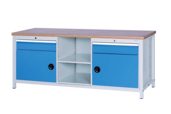Werkbank, Höhe x Breite x Tiefe 860 x 2000 x 750 mm, Tischplatte aus Buche-Massivholz, geölt, Plattenstärke 40 mm, Traglast 100 kg, Gestellausführung 4 Füße, Unterbau 2 Schubladen, 2 Schränke, 2 Ablageböden, links 1 Schublade, 1 Schrank, mitte 2 Ablageböden, rechts 1 Schublade, 1 Schrank, Schubladen Höhe 2x150 mm, Schubladennutzmaß Breite x Tiefe 600 x 600 mm, Traglast je Schublade 100 kg, Schubladen mit kugelgelagerter Rollenführung, Auszug 100 %, Schubladen zur Aufnahme von Einteilungsmaterial geschlitzt, mit Einzelauszugsperre, mit Griffleiste, mit Beschriftungsstreifen, verschließbar mit Zylinderschloss, Schubladen und Schrank gemeinsam verschließbar, Stahlkonstruktion, Gestell mit Pulverbeschichtung in Farbe wählbar, Front mit Pulverbeschichtung in Farbe wählbar.