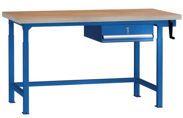 Werkbank, Höhe x Breite x Tiefe 750 - 950 x 1500 x 800 mm, Tischplatte aus Multiplex, Plattenstärke 45 mm, Traglast 350 kg, Höhenverstellung über Handkurbel, Unterbau 1 Schublade, Schubladen Höhe 1x150 mm, Traglast je Schublade 100 kg, Schubladenauszug 90 %, Stahlkonstruktion, Gestell mit Einbrennlackierung in Farbe wählbar, Front mit Einbrennlackierung in Farbe wählbar.