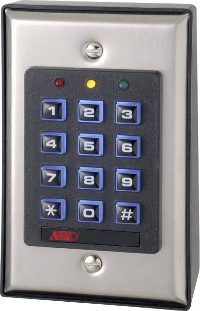 Ausgänge: Ausgang 1: 5 A, NC- und NO-Trockenkontakte, max. 30 V Gleichstrom, Ausgang 2: 1 A, NC- und NO-Trockenkontakte, max. 30 V Gleichstrom, Ausgang 3: NPN-Transistor mit offenem Kollektor für weitere Steuerungsmöglichkeiten · Zugangsschleusen-Funktion · Verriegelung Ausgang 1 · Alarm bei offener (angelehnter) Tür · Automatischer Zutritt oder Zutritt mit Code · Relaisaktivierungsanzeige · Akustische Signale für Ein/Aus · Ausgang Tastatur aktiviert · Automatische Türverriegelung · Alarmausgang · Duress-Ausgang · Spannungsversorgung: 12 V Gleichstrom · LEDs zeigen den Einsatzzustand der Tastatur an · Duress-Ausgang: NPN-Transistor mit offenem Kollektor, schaltet auf (-), wenn aktiviert, max. Belastbarkeit von 100 mA/25 V Gleichstrom. · Verfügbare Codes: Benutzercodes 1 & 2, Superbenutzercode, Mastercode, Duress-Code und Kurzcode.