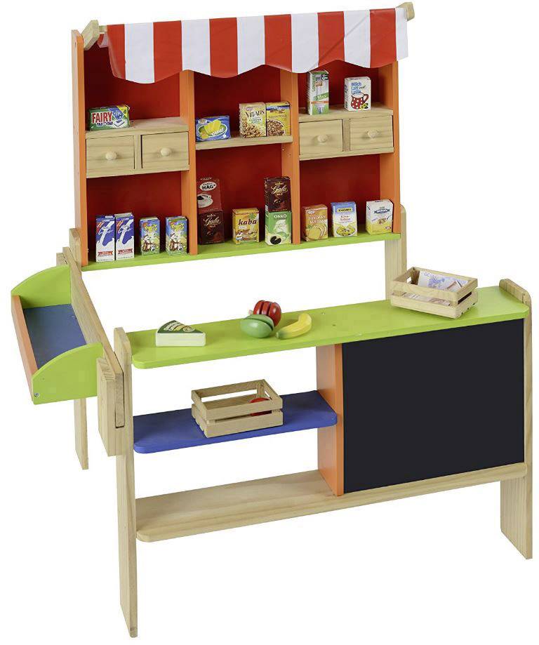 Kaufladen aus Holz mit bunt lackierten Elementen, 4 Schubläden, Tafel und rot/weiß gestreifter Markise. Dank eines einfachen Stecksystems ist die Seitentheke kinderleicht ohne Werkzeug abzunehmen. FSC-zertifiziertes Holz.