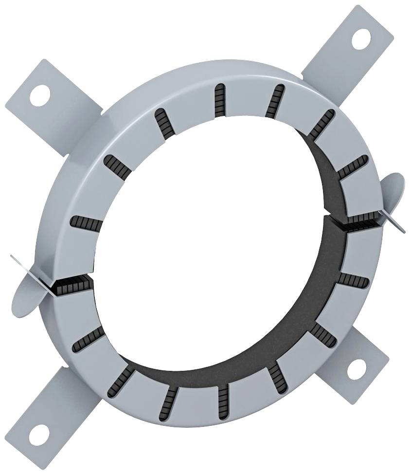 Rohrmanschette für brennbare Rohre aus im Stahlblechgehäuse eingefasster Brandschutzeinlagen, diese drücken im Brandfall die abbrennenden thermoplastischen Rohre mit sehr hohem Blähdruck zu. Befestigung mit Dübeln oder Gewindestangen