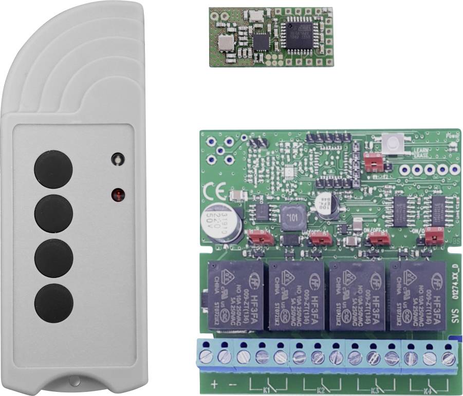 Um die 4 potentialfreien Wechselkontakte mit den Handsender fernsteuern zu können, muss das Funkmodul in die Schaltstufe eingelötet werden. Die 4 Tasten des Senders sind den 4 Ausgängen des Empfängers fest zugeordnet. Jeder Ausgang des Empfängers besteht aus einen potentialfreien Wechselkontakt und kann entweder im Tast- oder im Togglemodus betrieben werden.
