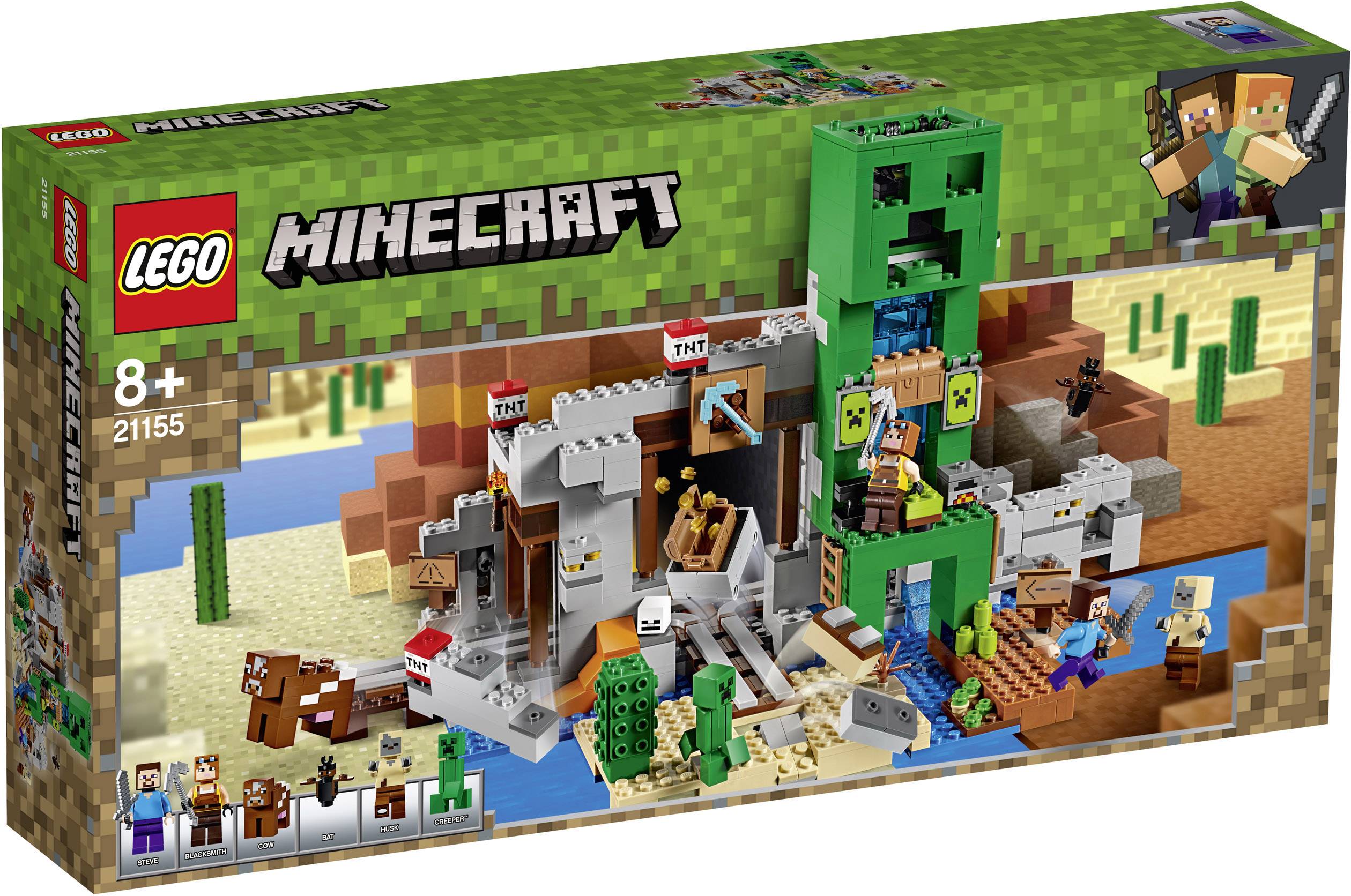 Komm in den Genuss actiongeladener Minecraft™-Abenteuer – mit dem LEGO® Minecraft Set „Die Creeper™ Mine“ (21155). Das Modell wurde für alle Fans des beliebten Videospiels entworfen und steckt voller spannender Merkmale und Funktionen (neu ab August 2019). Kinder können gegen den Creeper und den Wüstenzombie antreten, mit dem TNT Sprengungen durchführen und das geschürfte Gold in einer riesigen Creeper-Statue abladen, die es mithilfe eines Hebels direkt in eine Truhe befördert. Dieses LEGO Minecraft Sammlerspielzeug enthält auch funktionstüchtige Schienen mit einer Lore und einen detailreichen Minecraft-Unterschlupf mit Bett, Amboss, Ofen, Truhe und Gemüsebeet. Das Set kann mit anderen Spielsets kombiniert werden, um ein einzigartiges LEGO Minecraft Universum zum Spielen und Ausstellen zu erschaffen. Enthält 3 Minifiguren – Steve, einen Schmied und einen Wüstenzombie – sowie Creeper-, Kuh- und Fledermausfiguren.
