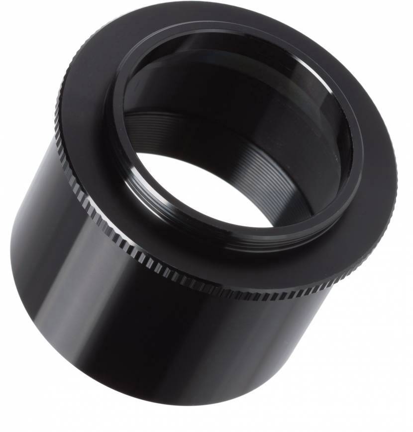 Ermöglicht den Anschluß von Kameras an Teleskope mit 2" Steckaufnahme. Zusätzlich wird ein T2-Ring auf den entsprechenden Kameratyp benötigt. Das besondere an diesem Adapter ist der sehr kurze zusätzlich benötigte Lichtweg von nur 2,0 mm, der die Verwendung einer Kamera auch an Teleskopen mit einem knappen Fokusweg ermöglicht. Ein 2" Filtergewinde ist teleskopseitig ebenfalls vorhanden.