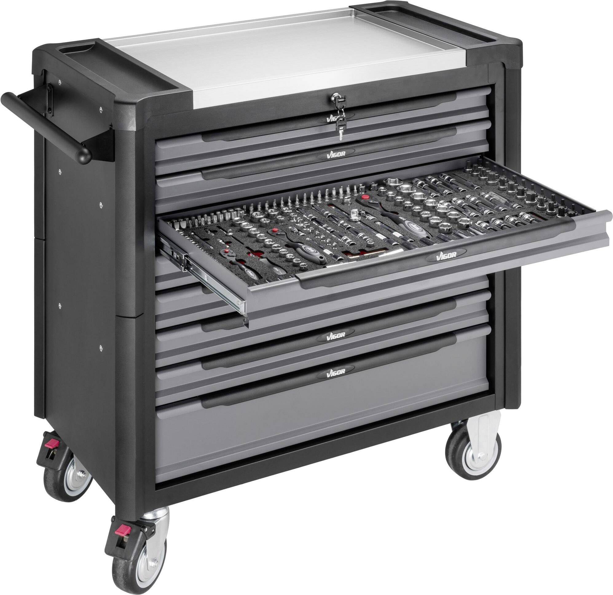 Aufbewahrung von Werkzeug Werkstattwagen mit Edelstahl-Arbeitsplatte und Sortiment Pulverbeschichteter Korpus, besonders resistent gegen Kratzer Fahrgriff ermöglicht einfaches Rangieren Traglast pro Schubfach: 25 kg Farbe: RAL 9005 / RAL 7004 Gewicht Wagen: 84 kg Gesamttragkraft (statisch): 500 kg Schubfach Abmessung: 7 x 753 x 398 x 75 mm 1 x 753 x 398 x 154 mm Einlagenmaß / Schubfachgröße: 4/3+ (750 x 393 mm) Gegenseitige Auszugssperre für minimales Kipprisiko Zentralverriegelung mit Zylinderschloss Anzahl Bockrollen: 2 Anzahl Lenkrollen: 2 Anzahl Rollen mit Bremse: 2 Länge x Breite x Höhe: 940 x 514 x 1000 mm Werkstattwagen Rammschutz: Senkrechter, durchgehender Kantenschutz auf allen vier Fahrzeugecken
