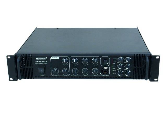 6-Zonen-ELA-Mono-Mischverstärker · Komfortable Ansteuerung für ELA-Lautsprecher über 6-Zonen-Technik · 6 ELA-Zonenausgänge (100 V) jeweils mit 5-stufigem Lautstärkesteller · Master-ELA-Lautsprecherausgang (70 und 100 V) · Anschlussmöglichkeit für niederohmige Lautsprecher (4-16 Ohm) · 2 rückseitige Mikrofon-Eingänge (6,3-mm-Klinke, unsym.) · 1 frontseitiger Mikrofon-Eingang (Kombination XLR/6,3-mm-Klinke, unsym.) auf der Frontplatte mit regelbarer Prioritätsfunktion · Alle Mikrofon-Eingänge mit getrennten Lautstärkereglern · 3 Line-Eingänge (Stereo-Cinch) mit getrennten Lautstärkereglern · 1 Line-Ausgang (Stereo-Cinch) · Gong, schaltbar · Höhen- und Bass-Klangregler für Ausgangssignal · 7-fache LED-Pegelanzeige · Lüftergekühlt · Schutzschaltungen mit LED-Anzeige: Überspannung, Kurzschluss, Einschaltverzögerung · Rackeinbau