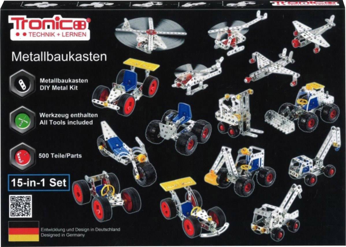 Tronico Starterbaukasten - Fahrzeuge aus Metall, 15-in-1 Konstruktionsset, Baufahrzeuge, Flugzeuge, Rennautos, es kann jeweils 1 Modell zusammengebaut werden, ideal für Einsteiger geeignet um das Zusammenbauen mit einem Metallbaukasten zu lernen, silberfarben mit farbigen Kunststoffteilen, Freilauf. Alle Teile nur verschraubt und mit Muttern gekontert, hergestellt aus hochwertigem Metall, inklusive Werkzeug und 4-farbige Aufbauanleitung, Altersempfehlung ab 8 Jahren, Kartonverpackung
