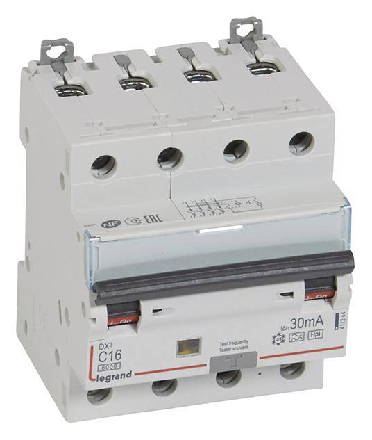 Legrand FI/LS-Schutzschalter DX3, Typ A-Hpi, für Wechsel- und pulsierende Gleichfehlerströme. Nach EN 61009-1, kurzzeitverzögert, verzögert mindestens 10 ms. LS-Schutzschalterteil: C-Kennlinie. Bemessungsspannung: 230/400 V~ , Bemessungsschaltvermögen Icn 6 kA, Auslöseanzeige: blau=Fehlerstrom-oder Prüftastenauslösung, farblos= Kurzschluss-oder Handauslösung. Befestigung auf Hutprofilschiene EN 60715 durch rastende Schnellbefestigungen, klare Information vorne auf jedem Gerät, eindeutige Schaltstellungsanzeige rot/grün am Schalthebel (verriegelbar), mit Beschriftungsfenster, mit Untersteckschutz zum sicheren Einführen des Leiters in Fahrstuhlklemme, Anbau von Hilfsgeräten möglich.