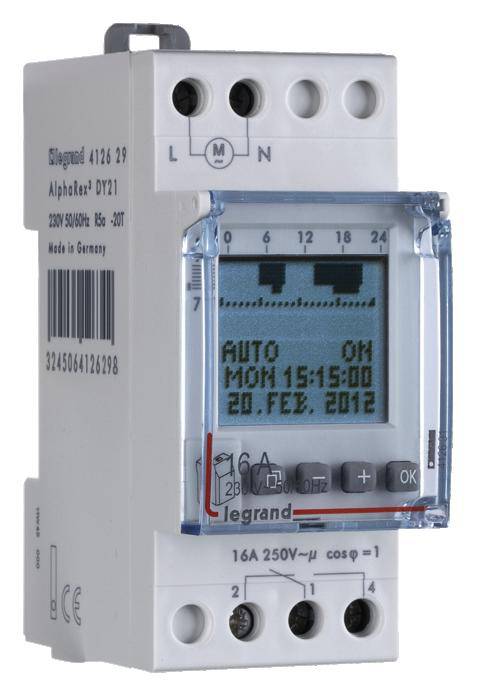 AlphaRex DY21s, digitale Jahreszeitschaltuhr mit Steuereingang, Reiheneinbau, Jahres- und Wochenzeitschaltuhr mit zusätzlicher Astro-Funktion. Mit textgeführtem Programmierkonzept. Sekundengenaue Programmierung. Einfache Programmerstellung mittels PC unter Verwendung der Legrand AlphaSoft und Datenschlüssel. Schaltzeiten als Wochenübersicht im Display sichtbar. 84 Schaltprogramme davon: 28 Wochenprogramme, 28 Jahresprogramme, 28 Ausnahmeprogramme (Prioritätsprogramm). Kürzeste Schaltzeit 1 Sek., Schaltschritt 1 Sek.. Gangreserve 5 Jahre für Datum und Uhrzeit. EEPROM Speicher zur Sicherung der Schaltprogramme. Zusätzliche Komfortfunktionen: Astrofunktion (Sonnenauf-/untergänge) kombinierbar mit Schaltuhrfunktion, Offset für Sonnenauf- und untergangszeit einstellbar über Zeit-Offset +/- 120 min. oder Winkel-Offset +/- 12°00´ . Ferienprogramm, Zufallsprogramm, Zyklusfunktion, Betriebsstundenzähler, PIN-Code Eingabesperre, 1h-Test, Hintergrundbeleuchtung, automatische Sommer-/Winterzeitumstellung, Netzsynchronbetrieb einstellbar, Handschaltung, mit Nulldurchgangsschaltung. Schaltausgang: 1 Wechsler 250V/ 50 Hz, 16 A~ cos phi = 1