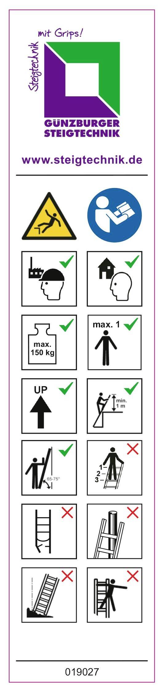 Gemäß DIN EN 131-3 sind produktspezifische Aufkleber mit Benutzerhinweisen anzubringen. Die Erklärung zu den verwendeten Piktogrammen finden Sie in unserer PDF-Datei