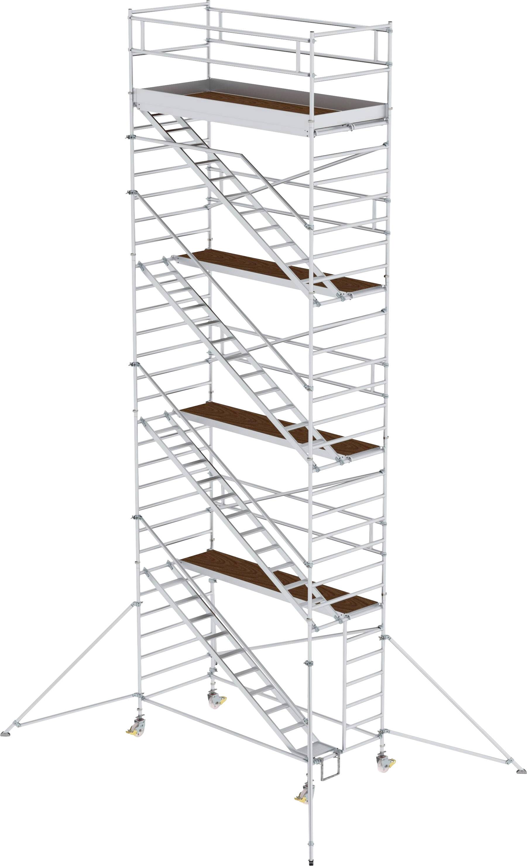 Rollgerüst aus stabilem Aluminium-Rundrohr mit geschweißten Rahmenteilen Schrägaufstiege von Plattform zu Plattform mit 100 mm tiefen Stufen und Handlauf für den sicheren Auf- und Abstieg wie auf einer Treppe, vor allem mit Lasten Baukastenprinzip für den flexiblen Einsatz: Alle Gerüstteile sind auch einzeln als Ersatz- oder Erweiterungsteile erhältlich Hohe Flexibilität und Stabilität durch klappbare Ausleger Ideal auch für den wandseitigen Aufbau oder das Verfahren in engen Gängen Ungehinderter Zugang dank Öffnung im Einstiegsrahmen Vier Lenkrollen Ø 200 mm mit zentrischer Lasteinleitung, Feststellern und Spindeln für Höhenausgleich Großformatige Arbeitsfläche mit 1.35 m Breite Aluminium Bordbretter und Geländerrahmen mit integrierter Knieleiste zur Absturzsicherung Werkzeugloser Auf- und Abbau von Plattform zu Plattform dank Steckverbindungen und Schnellverschlüssen Geringes Gewicht der Einzelteile für ein einfaches Handling Unterschiedliche Plattformlängen erhältlich (1.80 m / 2.45 m / 3.0 m) Arbeitshöhen bis 12.4 m GS-geprüft nach DIN EN 1004 Lastklasse / Gerüstgruppe 3: 2.0 kN / m²