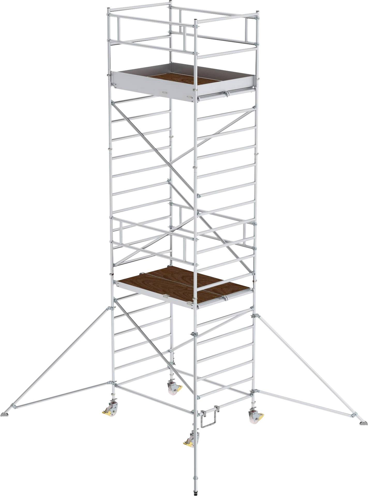 Rollgerüst aus stabilem Aluminium-Rundrohr mit geschweißten Rahmenteilen Baukastenprinzip für den flexiblen Einsatz: Alle Gerüstteile sind auch einzeln als Ersatz- oder Erweiterungsteile erhältlich Hohe Flexibilität und Stabilität durch klappbare Ausleger Ideal für den wandseitigen Aufbau oder das Verfahren in engen Gängen Vier Lenkrollen Ø 200 mm mit zentrischer Lasteinleitung, Feststellern und Spindeln für Höhenausgleich Großformatige Arbeitsfläche mit 1.35 m Breite Aluminium Bordbretter und Geländerrahmen mit integrierter Knieleiste zur Absturzsicherung Werkzeugloser Auf- und Abbau dank Steckverbindungen und Schnellverschlüssen Geringes Gewicht der Einzelteile für ein einfaches Handling Unterschiedliche Plattformlängen erhältlich (1.80 m / 2.45 m / 3.0 m) Arbeitshöhen bis 13.4 m GS-geprüft nach DIN EN 1004 Lastklasse / Gerüstgruppe 3: 2.0 kN / m²