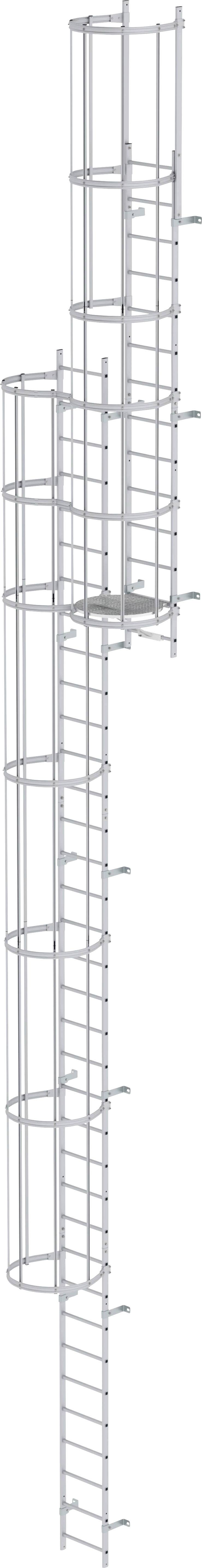 Einsatzbereich An Gebäuden für Wartungs- und Reinigungsarbeiten. Für Schornsteine gelten bzgl. Befestigung und Rückenschutz besondere Vorschriften. Unabhängig von der Steighöhe gilt: Als Absturzsicherung kann entweder Rückenschutz oder Steigschutz verwendet werden (Kombination nicht erlaubt, da die Rettung von Personen durch den Rückenschutz behindert wird) Arbeitsmedizinische Untersuchung zur Höhentauglichkeit (z. B. G 41), die Notwendigkeit hängt von der Gefährdungsbeurteilung (u. a. Personenkreis, Gesamtsteighöhe) der jeweiligen Steigleiteranlagen ab Ein Nachweis für die Tragfähigkeit des Untergrunds muss für jedes Bauvorhaben durch einen verantwortlichen Sachverständigen für Standsicherheit geprüft und abgenommen werden Durchgangssperre (Sicherungstüre) empfehlenswert. Liegt die Ausstiegsstelle an Verkehrswegen oder Arbeitsplätzen, wird eine Durchgangssperre benötigt Die senkrechte Überschneidung von aufeinanderfolgenden Leiterzügen muss mindestens 1.680 mm betragen An ungesicherten Ausstiegsstellen sind beidseitig zur Steigleiter angebrachte oder in die Ausstiegsebene geführte Geländer erforderlich Spalt beim Austritt darf nicht größer als 75 mm sein Antrittsmaß: Abstand Einstiegsebene bis zur ersten Sprosse 100 – 400 mm. Beim Ausstieg nach vorne muss die oberste Sprosse auf der Höhe der Ausstiegsebene liegen Bei Steigleitern mit Steigschutz muss bei Durchstiegen der Freifläche vor der Leiter mindestens 800 x 800 mm betragen. Bei Neuanlagen im Bestand sollten diese Maße ebenfalls eingehalten werden Die Spaltmaße zwischen Steigleiteranlage und Geländer dürfen maximal 120 mm betragen Die Verbindung zum Steigschutz muss von einem gesicherten Standplatz aus herzustellen und zu lösen sein. Ein gesicherter Standplatz ist z. B. ein Podest mit Geländer und einem gesicherten Zugang Für ein sicheres Umgreifen der Seitenholme muss der Freiraum zu angrenzenden Teilen um die Seitenholme herum mindestens 75 mm betragen (mit Ausnahme von Bauteilen die zur Steigleiteranlage gehören)