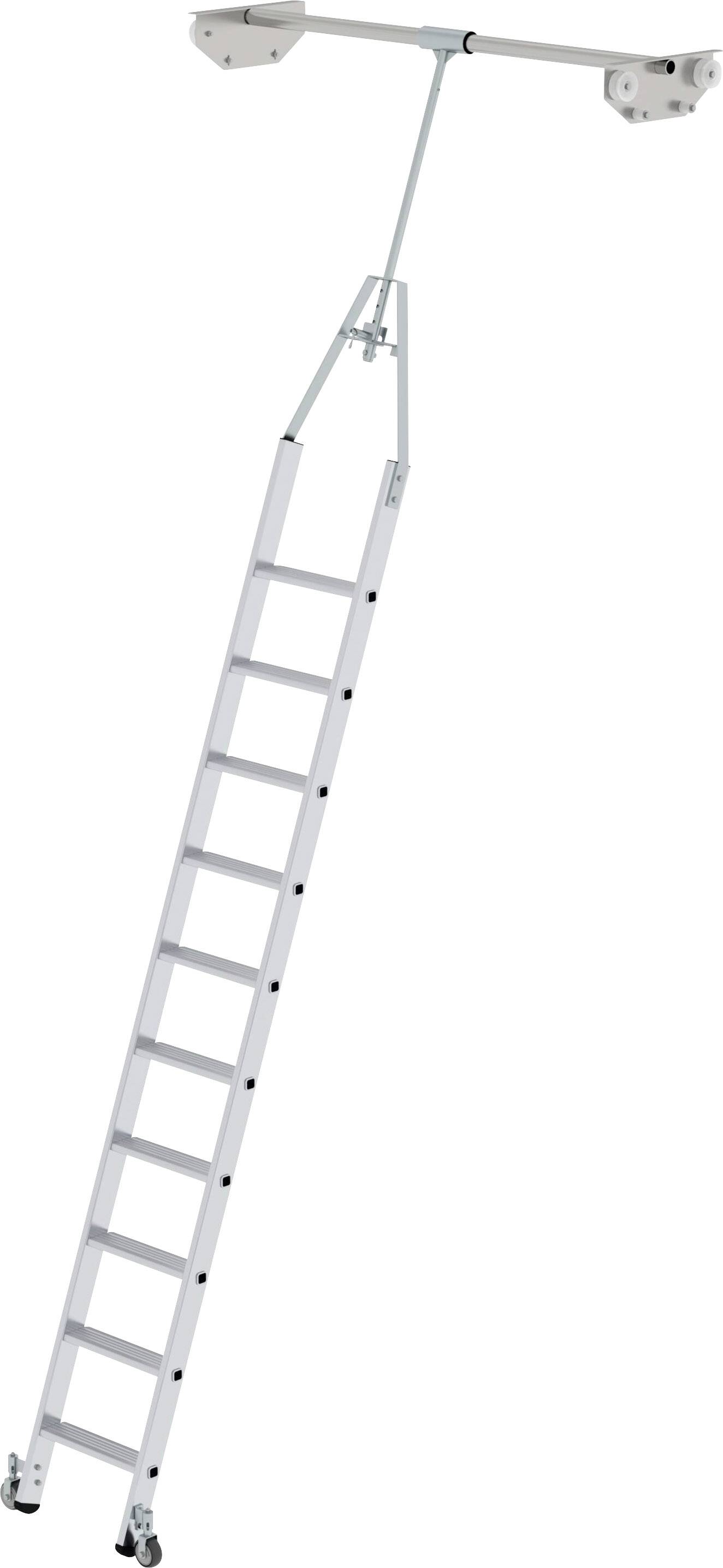 Stufen-Regalleiter aus Aluminium Stabile Rechteckrohr-Holme 80 mm tiefe, geriffelte Stufen 4-fach gebördelte Stufen- / Holmverbindung Für Doppelregale mit Gangbreiten bis 1.60 m (Schwankungen bis 20 mm werden vom Laufwerk ausgeglichen) Laufruhiges Kopffahrwerk für ein leichtes Verschieben der Leiter Selbstarretierende Federrollen Ø 80 mm am unteren Ende Rutschfeste Leiternschuhe Stufenabstand: 235 mm Leiterbreite: 400 mm (ohne Rollen) Leiterbreite mit Rollen: 580 mm Leiterneigung: 70° Maximale Belastung: 150 kg Hinweis: Regalleitern werden in den nebenstehenden Standardlängen sowie individuell auf Maß gefertigt. Hierfür bitte jeweils die genaue senkrechte Einhänge und Schienenhöhe sowie Gangbreite und -länge angeben – beim Preis wird die nächsthöhere Leiter sowie eine Änderungspauschale von 51.00 Euro UVP ohne MwSt. berechnet. Auf Maß gefertigte Regalleitern sind vom Umtausch ausgeschlossen.