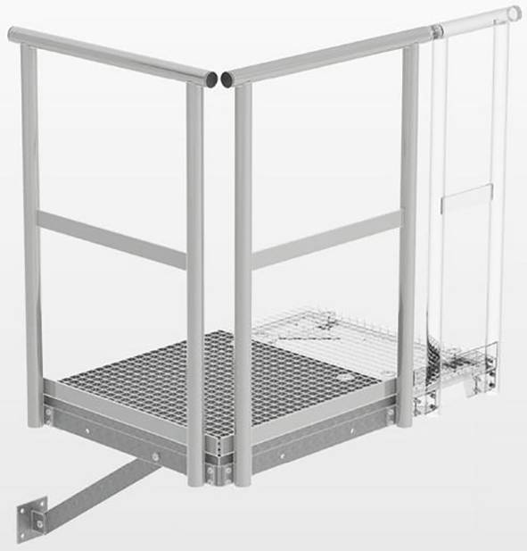 Gitterrostbelag mit zwei Anbaukonsolen aus Stahl Geländer an einer Längs- und Stirnseite Entspricht DIN 14094 Sonderkonsolen für WDVS-Fassaden / Isolierfassaden auf Anfrage Flächenlast: 4.0 kN / m² Einzellast: 2.0kN /  m²