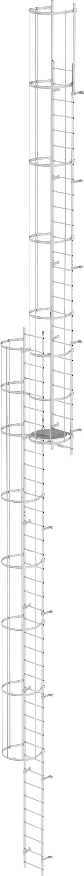 Einsatzbereich An Gebäuden für Wartungs- und Reinigungsarbeiten. Für Schornsteine gelten bzgl. Befestigung und Rückenschutz besondere Vorschriften. Unabhängig von der Steighöhe gilt: Als Absturzsicherung kann entweder Rückenschutz oder Steigschutz verwendet werden (Kombination nicht erlaubt, da die Rettung von Personen durch den Rückenschutz behindert wird) Arbeitsmedizinische Untersuchung zur Höhentauglichkeit (z. B. G 41), die Notwendigkeit hängt von der Gefährdungsbeurteilung (u. a. Personenkreis, Gesamtsteighöhe) der jeweiligen Steigleiteranlagen ab Ein Nachweis für die Tragfähigkeit des Untergrunds muss für jedes Bauvorhaben durch einen verantwortlichen Sachverständigen für Standsicherheit geprüft und abgenommen werden Durchgangssperre (Sicherungstüre) empfehlenswert. Liegt die Ausstiegsstelle an Verkehrswegen oder Arbeitsplätzen, wird eine Durchgangssperre benötigt Die senkrechte Überschneidung von aufeinanderfolgenden Leiterzügen muss mindestens 1.680 mm betragen An ungesicherten Ausstiegsstellen sind beidseitig zur Steigleiter angebrachte oder in die Ausstiegsebene geführte Geländer erforderlich Spalt beim Austritt darf nicht größer als 75 mm sein Antrittsmaß: Abstand Einstiegsebene bis zur ersten Sprosse 100 – 400 mm. Beim Ausstieg nach vorne muss die oberste Sprosse auf der Höhe der Ausstiegsebene liegen Bei Steigleitern mit Steigschutz muss bei Durchstiegen der Freifläche vor der Leiter mindestens 800 x 800 mm betragen. Bei Neuanlagen im Bestand sollten diese Maße ebenfalls eingehalten werden Die Spaltmaße zwischen Steigleiteranlage und Geländer dürfen maximal 120 mm betragen Die Verbindung zum Steigschutz muss von einem gesicherten Standplatz aus herzustellen und zu lösen sein. Ein gesicherter Standplatz ist z. B. ein Podest mit Geländer und einem gesicherten Zugang Für ein sicheres Umgreifen der Seitenholme muss der Freiraum zu angrenzenden Teilen um die Seitenholme herum mindestens 75 mm betragen (mit Ausnahme von Bauteilen die zur Steigleiteranlage gehören)