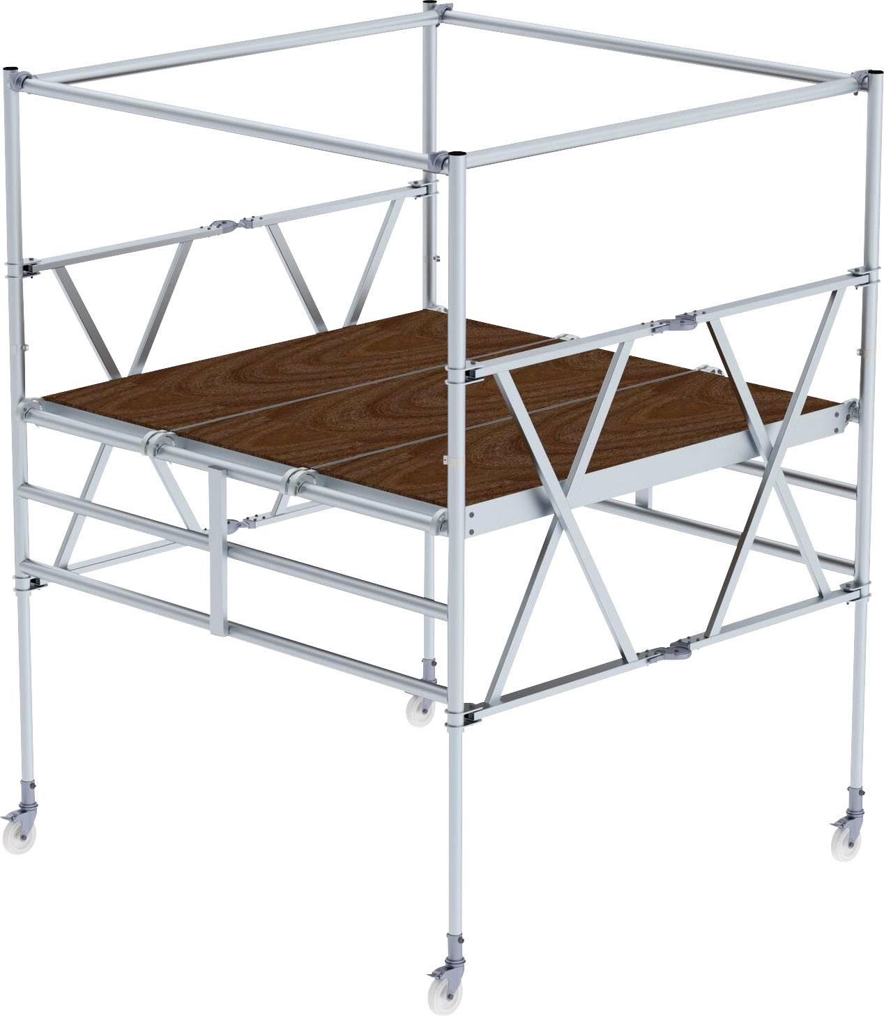 Rollgerüst aus stabilem Aluminium-Rundrohr mit geschweißten Rahmenteilen Doppel-Klapprahmen aus Rechteckrohr-Holmen mit selbstarretierenden Scharnieren Höhenverstellbare Standrohre zur Regulierung der Plattformhöhe im 15 cm Abstand von 0.53 m bis 1.63 m Großformatige Arbeitsfläche mit 3.25 m² Platzsparend bei Transport und Lagerung Vier Lenkrollen Ø 125 mm mit Feststellern Einfacher Auf- und Abbau ohne Werkzeug Optionale Aufstiegsleiter mit selbstschließenden Schnellverschlüssen für den bequemen Zu- und Abgang Arbeitshöhen bis 3.8 m Baumuster geprüft Lastklasse / Gerüstgruppe 2: 1.5 kN / m²