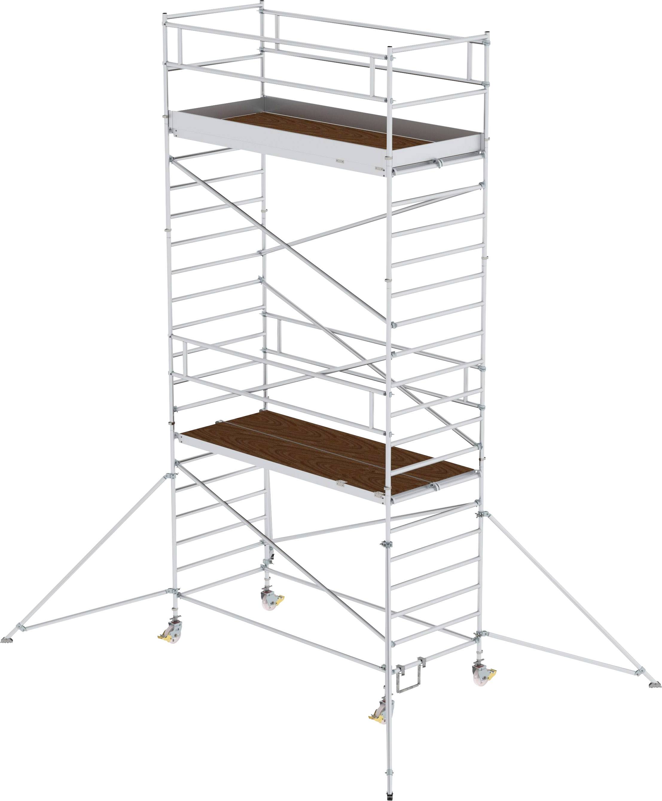 Rollgerüst aus stabilem Aluminium-Rundrohr mit geschweißten Rahmenteilen Baukastenprinzip für den flexiblen Einsatz: Alle Gerüstteile sind auch einzeln als Ersatz- oder Erweiterungsteile erhältlich Hohe Flexibilität und Stabilität durch klappbare Ausleger Ideal für den wandseitigen Aufbau oder das Verfahren in engen Gängen Vier Lenkrollen Ø 200 mm mit zentrischer Lasteinleitung, Feststellern und Spindeln für Höhenausgleich Großformatige Arbeitsfläche mit 1.35 m Breite Aluminium Bordbretter und Geländerrahmen mit integrierter Knieleiste zur Absturzsicherung Werkzeugloser Auf- und Abbau dank Steckverbindungen und Schnellverschlüssen Geringes Gewicht der Einzelteile für ein einfaches Handling Unterschiedliche Plattformlängen erhältlich (1.80 m / 2.45 m / 3.0 m) Arbeitshöhen bis 13.4 m GS-geprüft nach DIN EN 1004 Lastklasse / Gerüstgruppe 3: 2.0 kN / m²