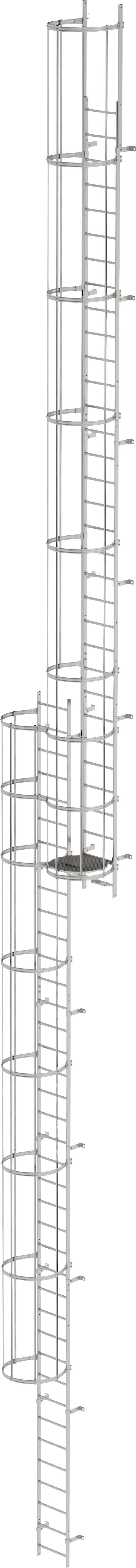 Einsatzbereich An Gebäuden für Wartungs- und Reinigungsarbeiten. Für Schornsteine gelten bzgl. Befestigung und Rückenschutz besondere Vorschriften. Unabhängig von der Steighöhe gilt: Als Absturzsicherung kann entweder Rückenschutz oder Steigschutz verwendet werden (Kombination nicht erlaubt, da die Rettung von Personen durch den Rückenschutz behindert wird) Arbeitsmedizinische Untersuchung zur Höhentauglichkeit (z. B. G 41), die Notwendigkeit hängt von der Gefährdungsbeurteilung (u. a. Personenkreis, Gesamtsteighöhe) der jeweiligen Steigleiteranlagen ab Ein Nachweis für die Tragfähigkeit des Untergrunds muss für jedes Bauvorhaben durch einen verantwortlichen Sachverständigen für Standsicherheit geprüft und abgenommen werden Durchgangssperre (Sicherungstüre) empfehlenswert. Liegt die Ausstiegsstelle an Verkehrswegen oder Arbeitsplätzen, wird eine Durchgangssperre benötigt Die senkrechte Überschneidung von aufeinanderfolgenden Leiterzügen muss mindestens 1.680 mm betragen An ungesicherten Ausstiegsstellen sind beidseitig zur Steigleiter angebrachte oder in die Ausstiegsebene geführte Geländer erforderlich Spalt beim Austritt darf nicht größer als 75 mm sein Antrittsmaß: Abstand Einstiegsebene bis zur ersten Sprosse 100 – 400 mm. Beim Ausstieg nach vorne muss die oberste Sprosse auf der Höhe der Ausstiegsebene liegen Bei Steigleitern mit Steigschutz muss bei Durchstiegen der Freifläche vor der Leiter mindestens 800 x 800 mm betragen. Bei Neuanlagen im Bestand sollten diese Maße ebenfalls eingehalten werden Die Spaltmaße zwischen Steigleiteranlage und Geländer dürfen maximal 120 mm betragen Die Verbindung zum Steigschutz muss von einem gesicherten Standplatz aus herzustellen und zu lösen sein. Ein gesicherter Standplatz ist z. B. ein Podest mit Geländer und einem gesicherten Zugang Für ein sicheres Umgreifen der Seitenholme muss der Freiraum zu angrenzenden Teilen um die Seitenholme herum mindestens 75 mm betragen (mit Ausnahme von Bauteilen die zur Steigleiteranlage gehören)